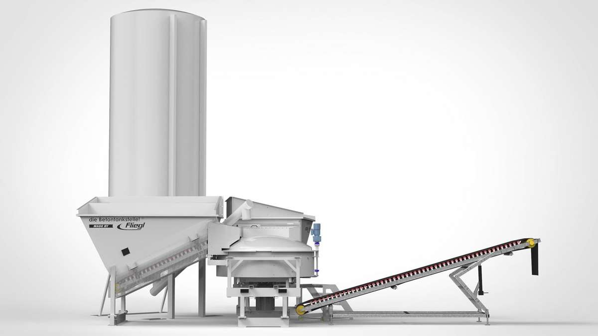Die Anlage wird mit Kies, der den Beton bindet, ohne Zugabe von Wasser gereinigt. Das Material wird nach dem Reinigungsvorgang über das Förderband ausgebracht und kann vollständig wiederverwendet werden.